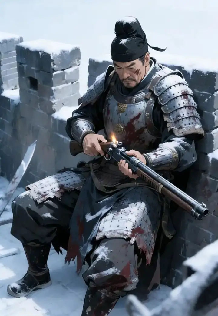 1638年1月8日傍晚,海州城的城墙上,城管中队长蔡荣正坐着擦拭、保养手头的散弹枪。